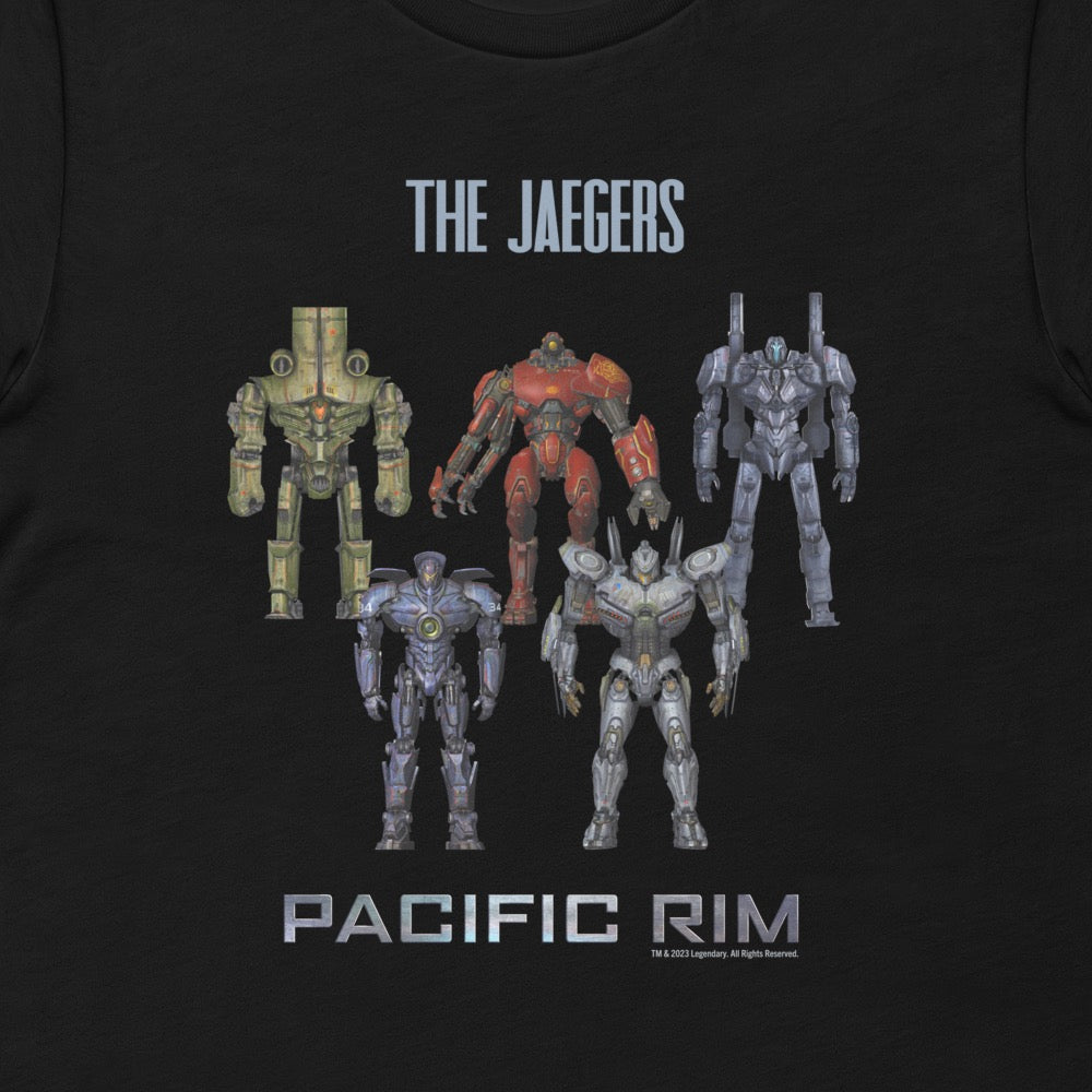 Prepare for the battle against Kaiju with the latest Pacific Rim apparel! This comfortable Jaegar Adult T-Shirt features all five of the mecha mobile weapons such as Gipsy Danger, Coyote Tango, and Crimson Tycoon.