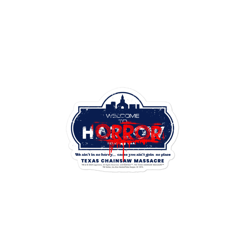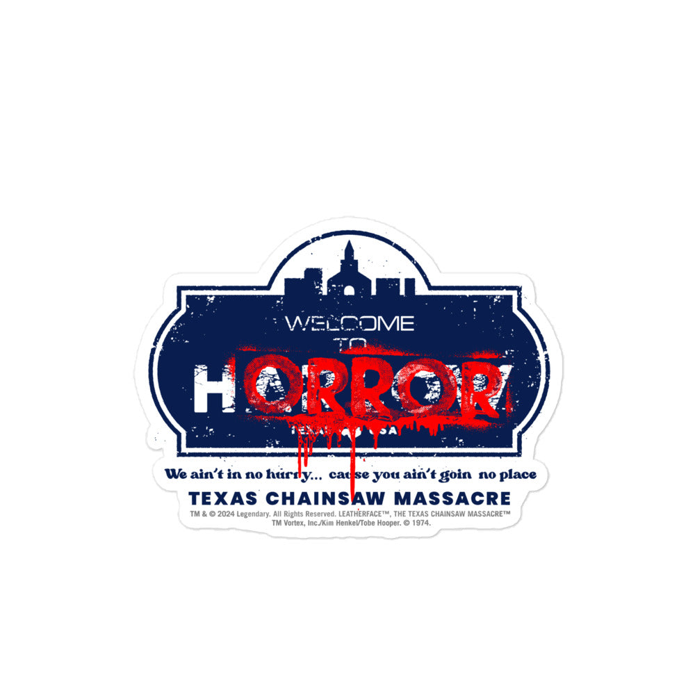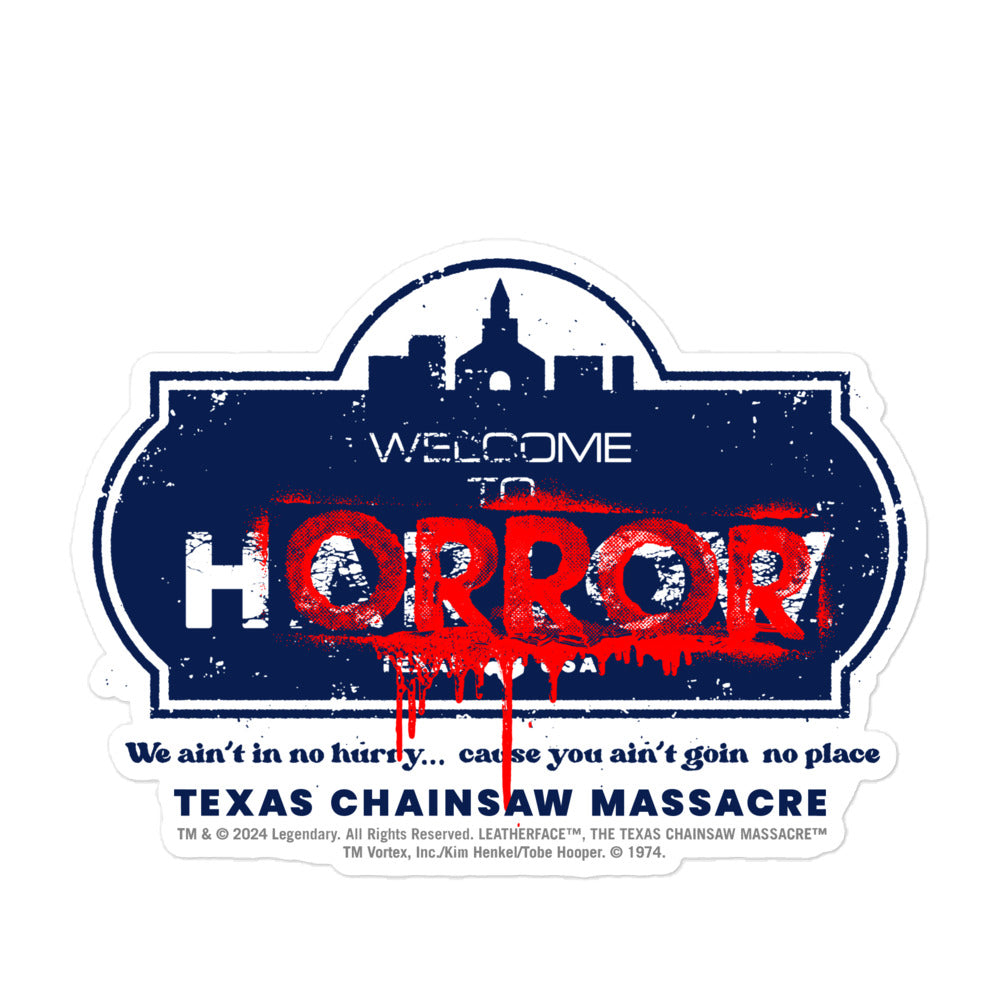 Immerse yourself in the chilling world of horror with the Texas Chainsaw Massacre Welcome to Horror Sticker. Perfect for any fan of the classic slasher film, this sticker features iconic imagery and a chilling message that sets the tone for a thrilling fright.