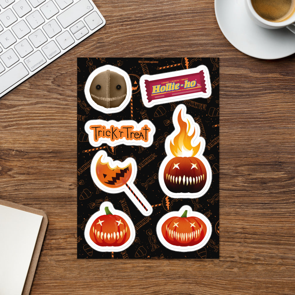 Elevate your Halloween spirit with our Trick 'r Treat Sticker Sheet! This vibrant collection of stickers is a must-have for any fan of the iconic horror anthology. Each sheet features a mix of spooky and fun designs inspired by the film, including Sam, creepy jack-o'-lanterns, and eerie treats.